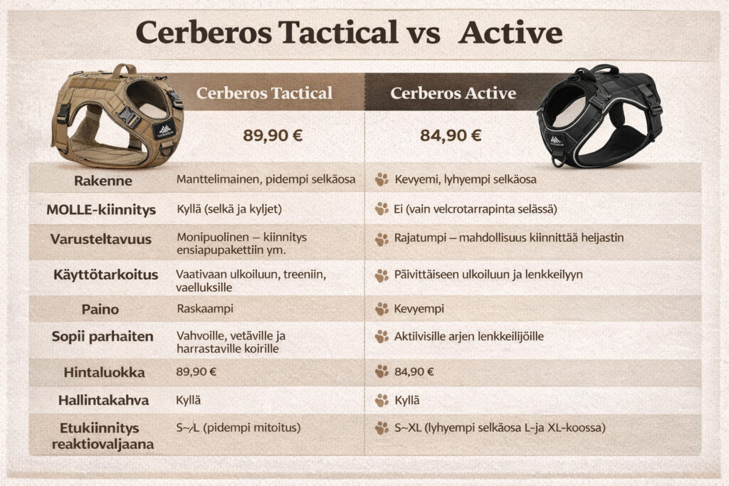 Markkinoilla on paljon erilaisia koiranvaljaita, mutta kaikki eivät sovi aktiiviseen tai voimakkaampaan käyttöön. Tässä artikkelissa keskitymme kahteen Cerberos-malliin, koska ne edustavat saman sarjan kahta erilaista käyttötarkoitusta: Tactical on raskaampi ja varusteltu, Active kevyempi ja yksinkertaisempi.